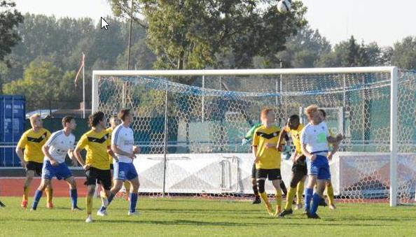 Christian Vandkrog har i bedste Uwe Seeler stil - med baghovedet - sendt bolden i en høj bue over venner og fjender, og scorer kampens sidste mål til slutresultatet 6-1